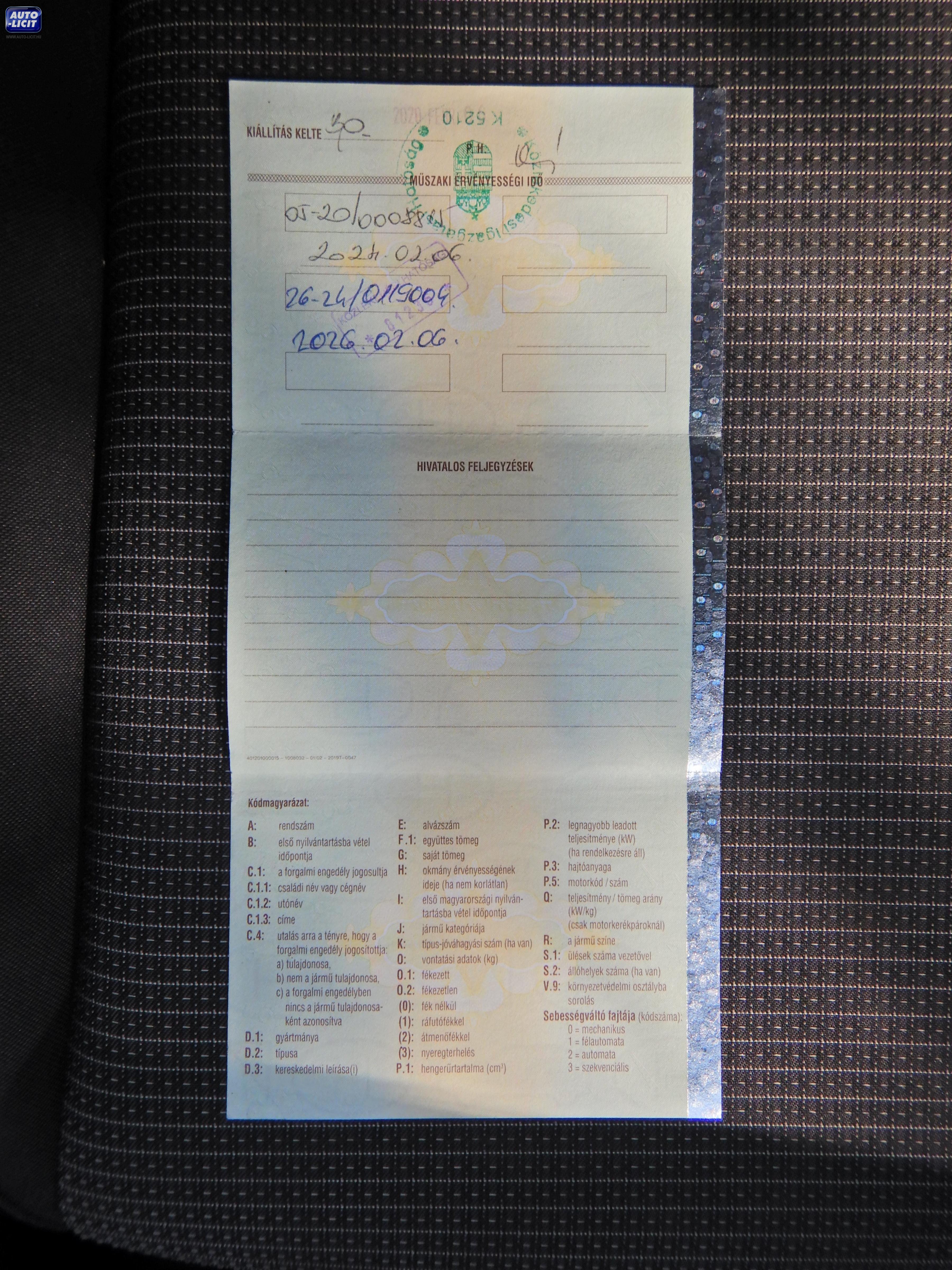 Műszaki érvényes: 2026.02.06 Első hazai forgalomba helyezés: 2020.02.06