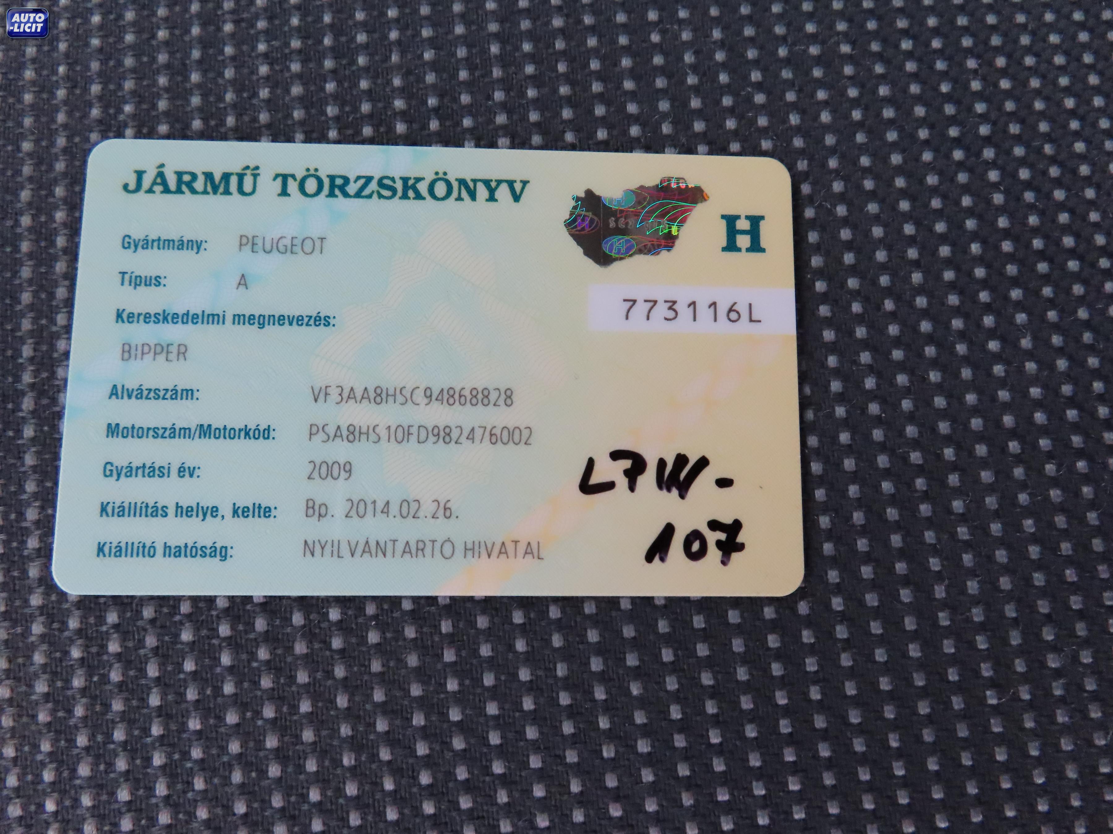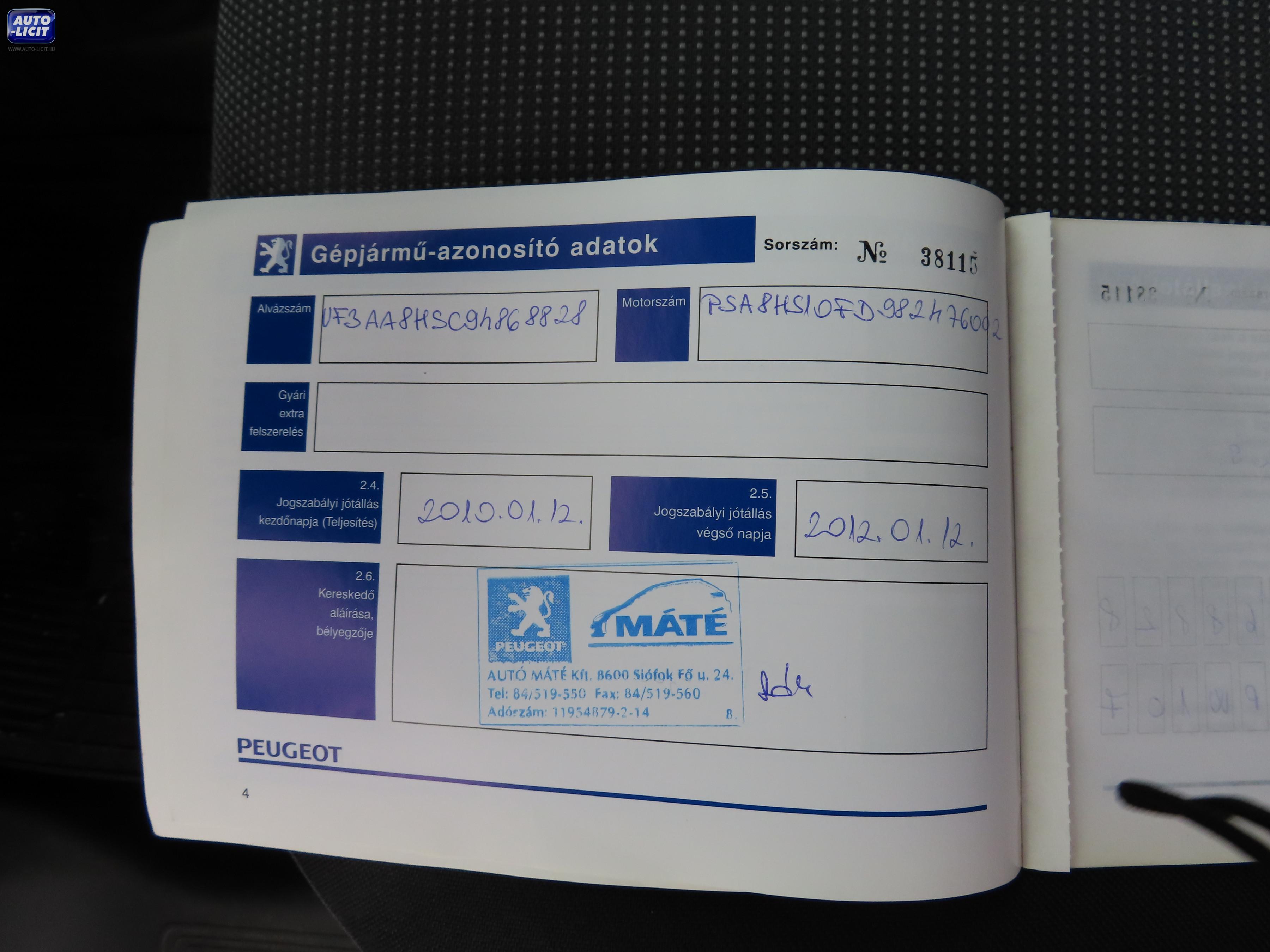 Alvázszám: VF3AA8HSC94868828 Motorszám: PSA8HS10FD982476002