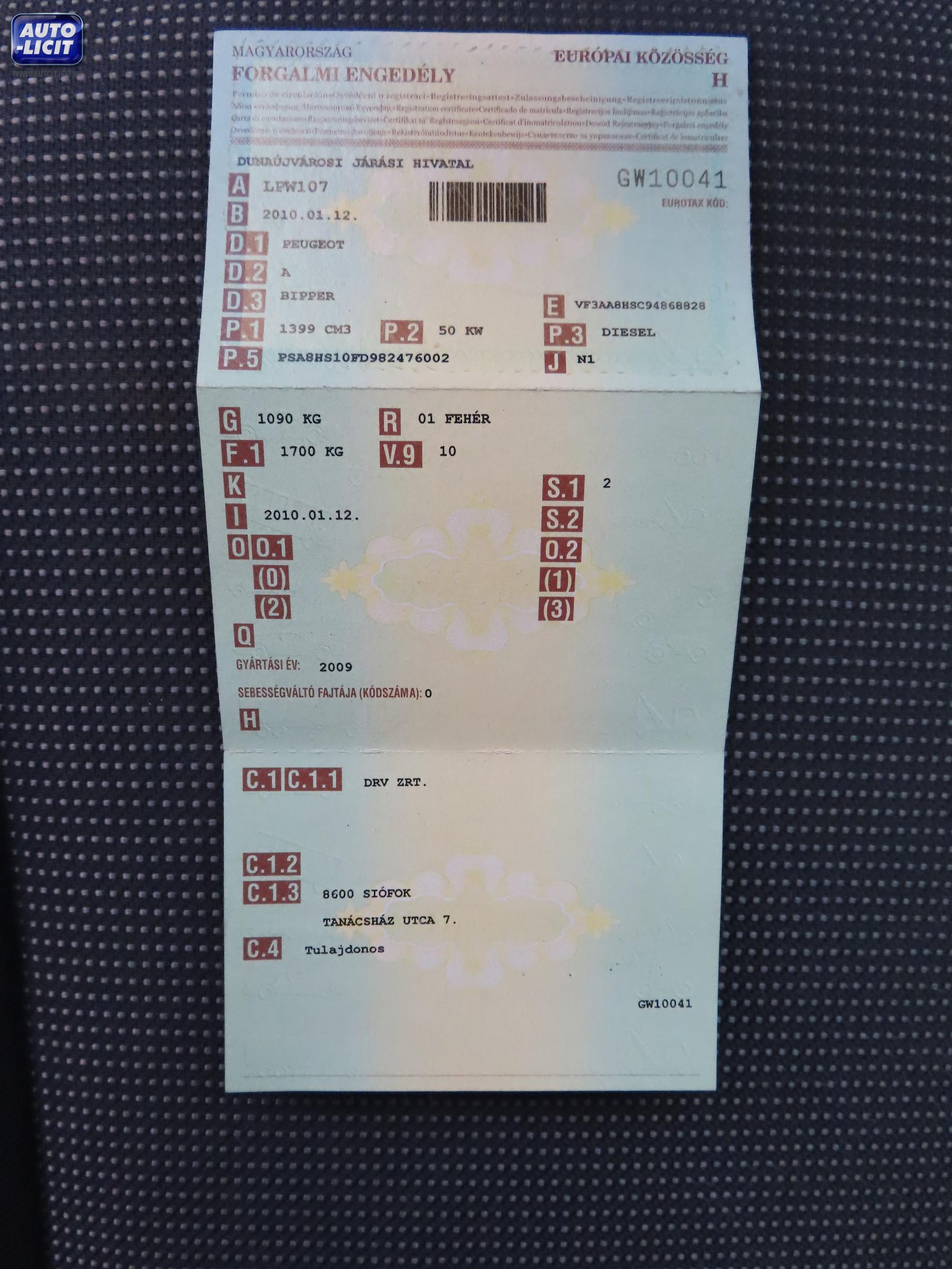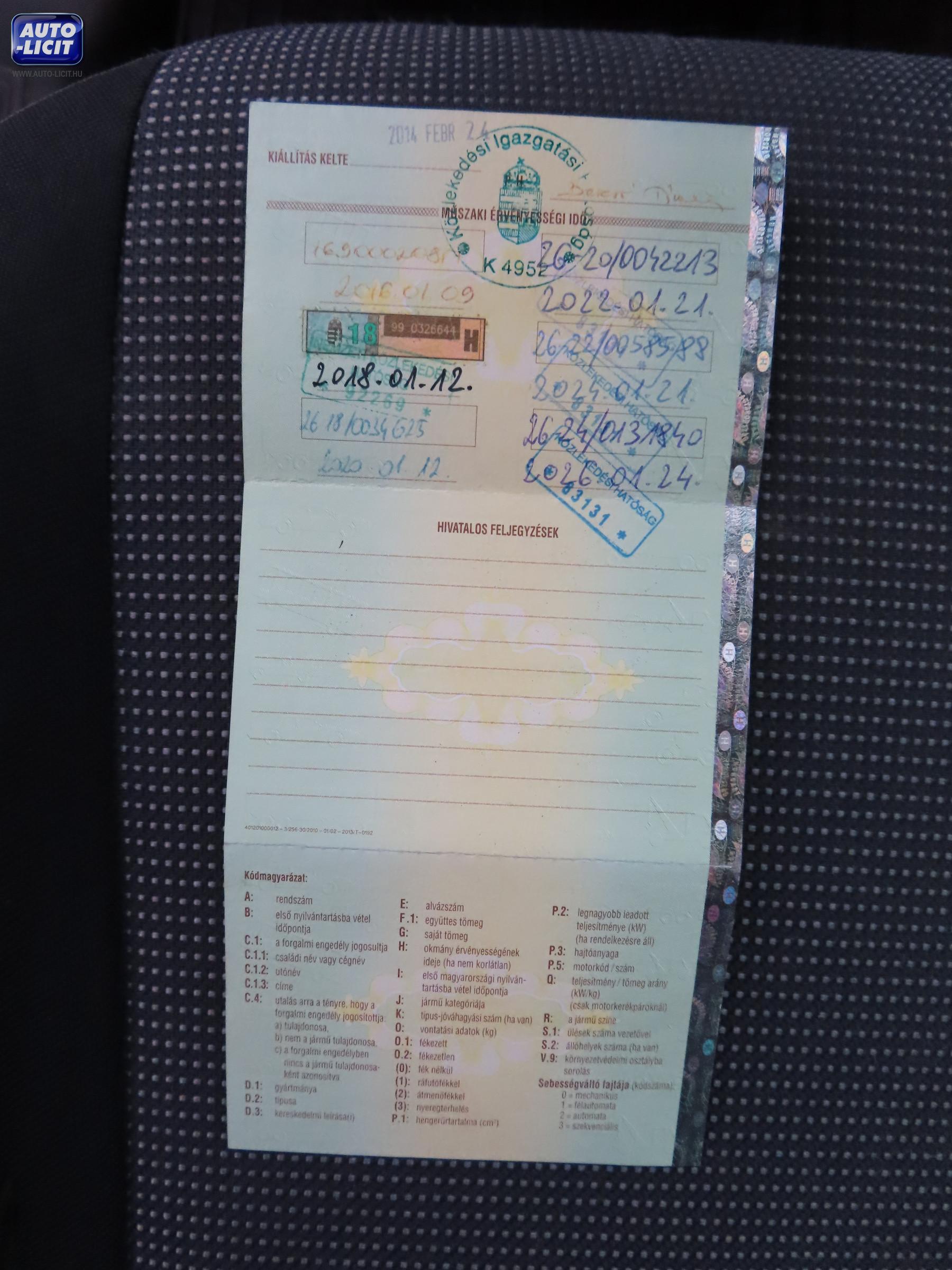 Műszaki érvényes: 2026.01.24 Első hazai forgalomba helyezés: 2010.01.12