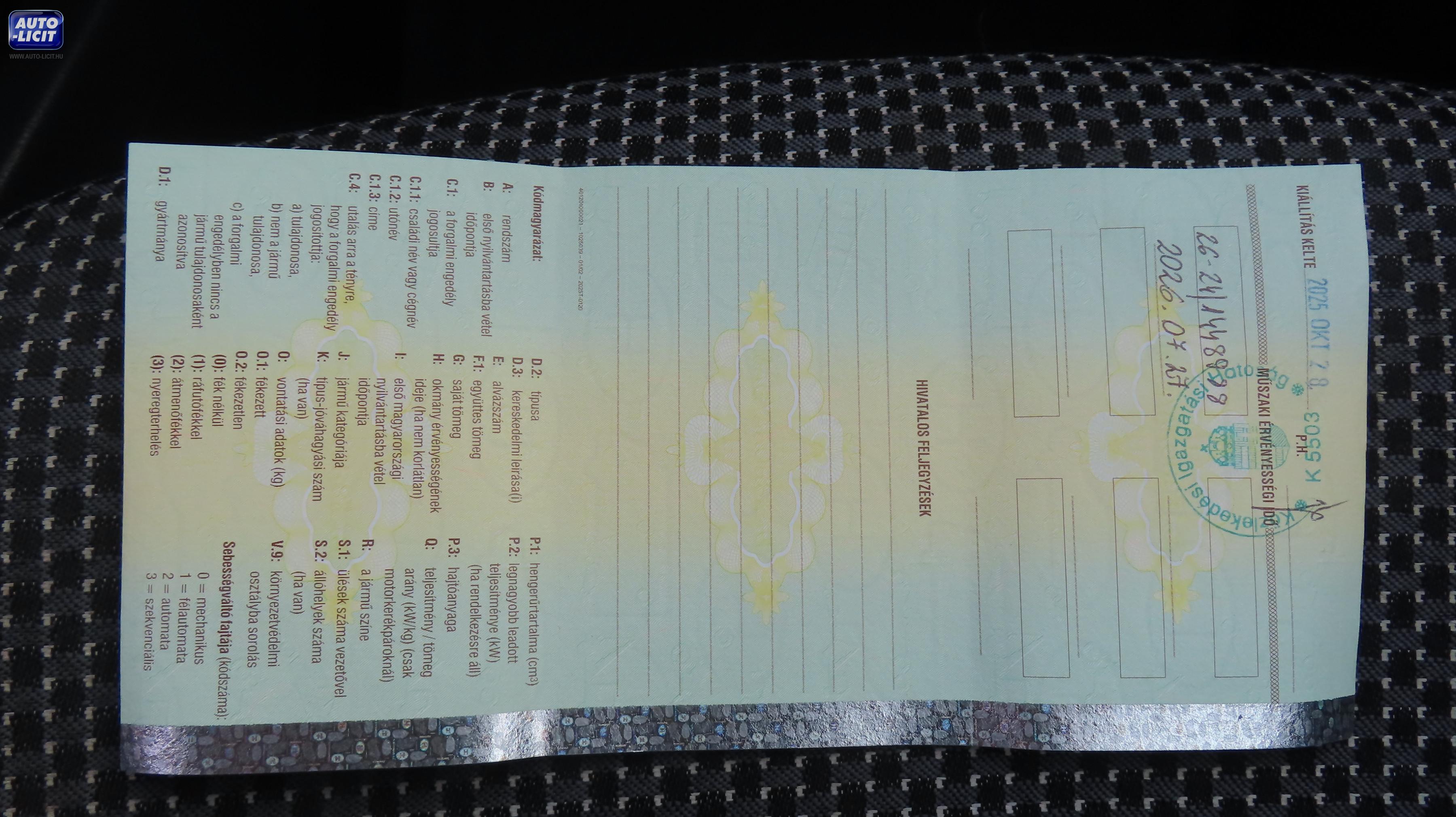 lásd megjegyzés (Tetőcsomagtartó elhasznált, A járművön körbe fénysérülések, karcok, apró horpadások vannak. Dísztárcsák töröttek. Első vészhárító karcos. Motorháztető kavics sérült. A jármű oldala karcos, féynsérült.) |