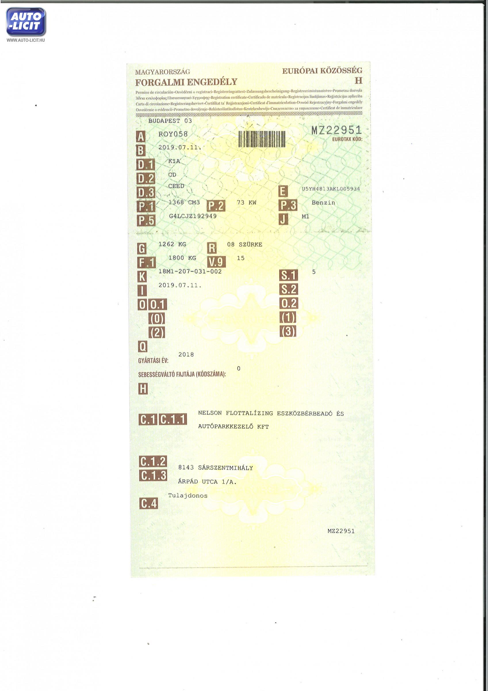 Műszaki érvényes: 2027.07.11 Első hazai forgalomba helyezés: 2019.07.11