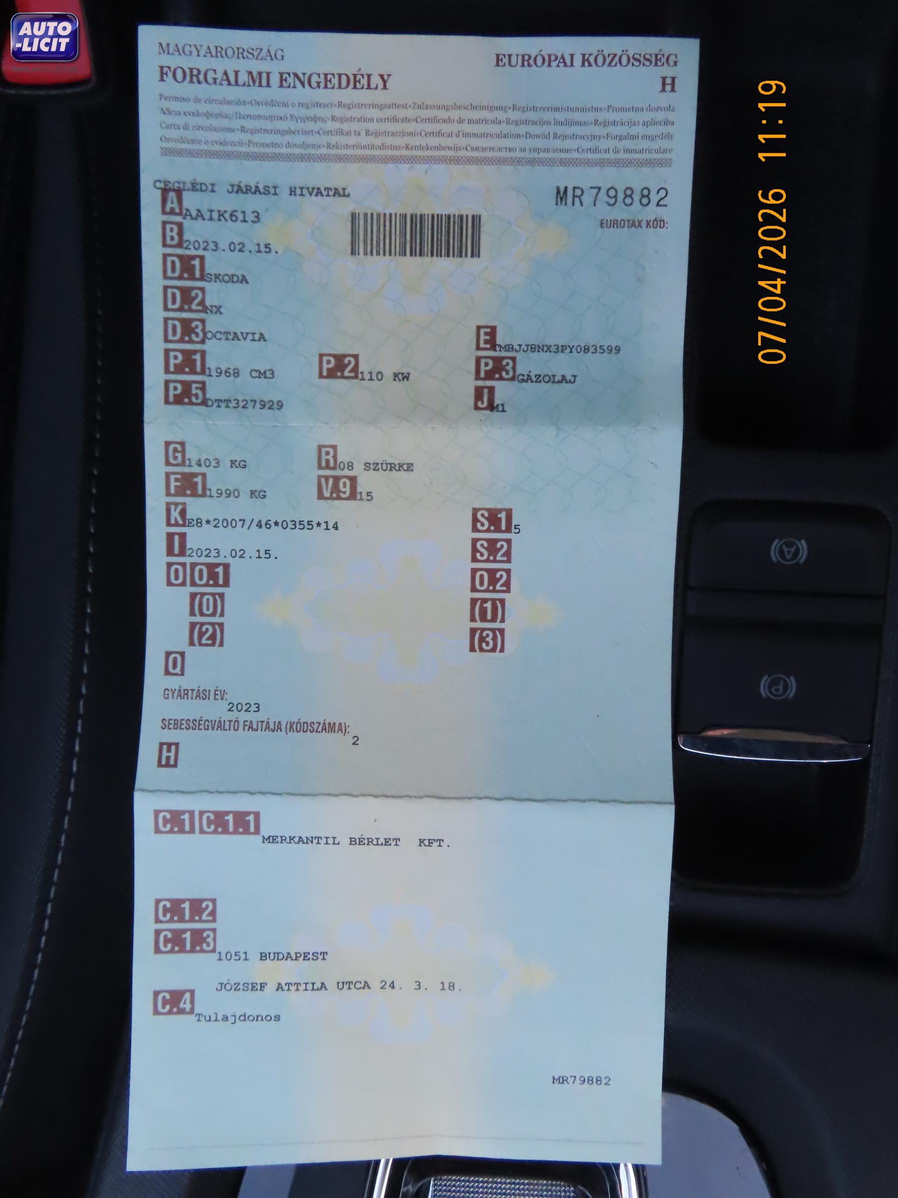 Műszaki érvényes: 2027.02.15 Első hazai forgalomba helyezés: 2023.02.15